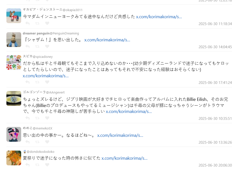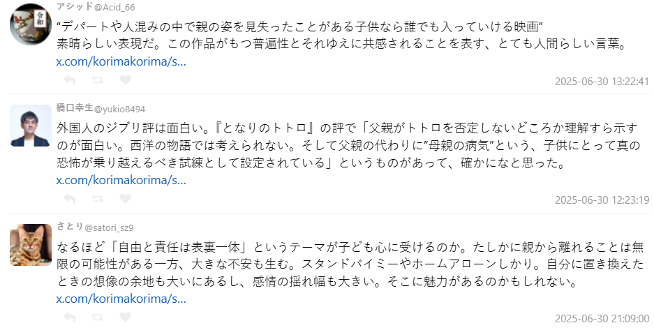 這句話讓日本網友こりま ( @korimakorima ) 深有所感,他在 X 上 Po 文寫道:「原本以為是因為畫面很日本才受歡迎,沒想到真正打動人的是那種『突然失去依靠』的感覺。全世界的孩子都有在人群中一瞬間找不到爸媽的經驗,那種不安的情緒,其實我們長大後也沒真的忘掉。」