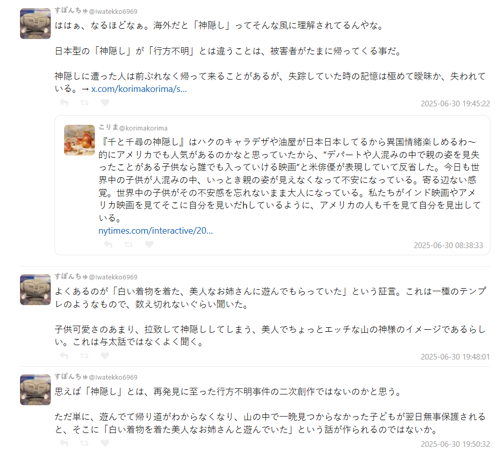 此外,有網友延伸討論「神隱」的意涵指出,日本傳統觀念中的「神隱」與一般失蹤不同:被神隱的人有時會突然自己回來,對於消失期間的記憶卻很模糊。甚至有「被白衣美女帶去玩」的常見說法,有人開玩笑說這其實是一種美麗又神祕的山神形象,是日本社會中常見的都市傳說。
