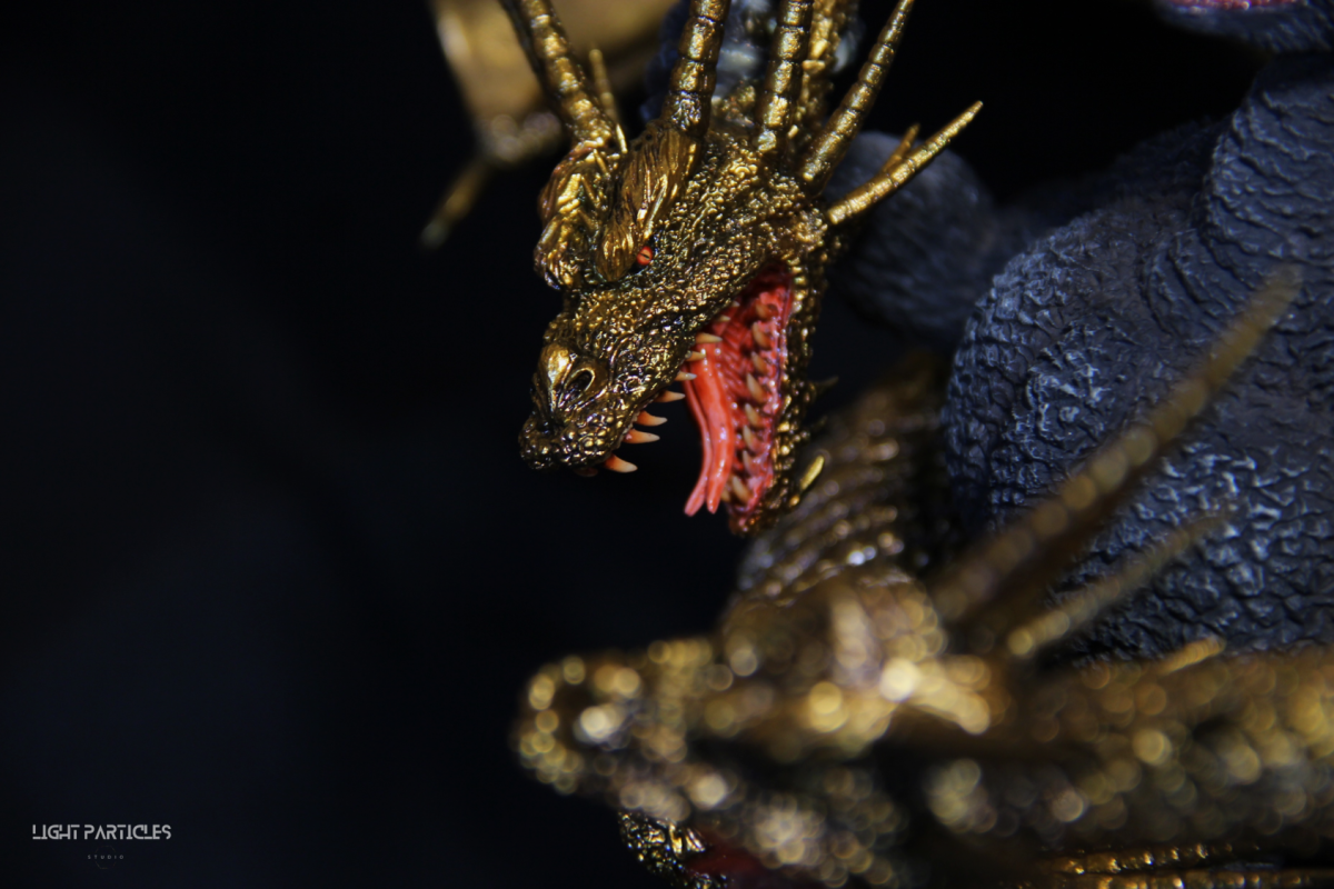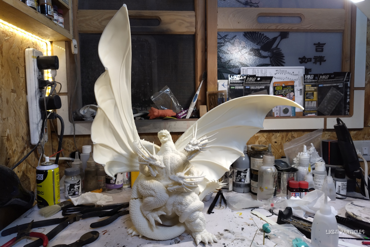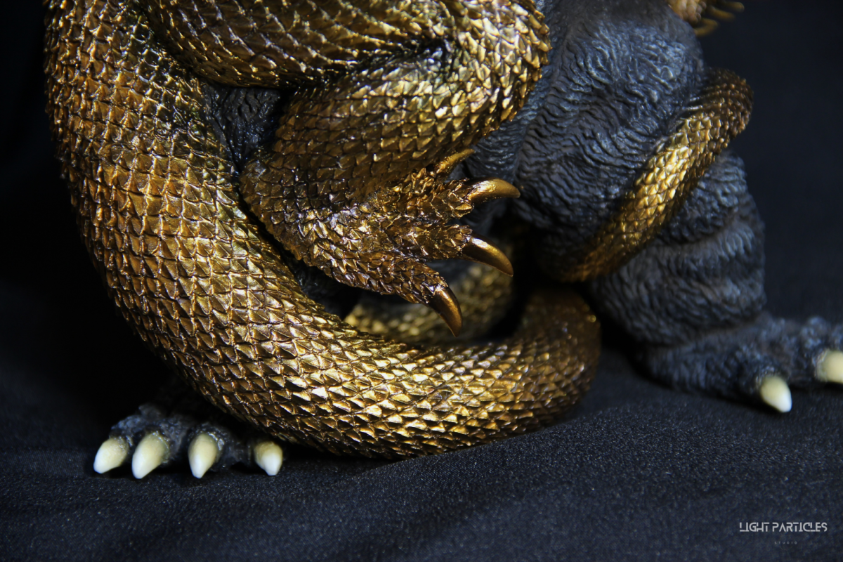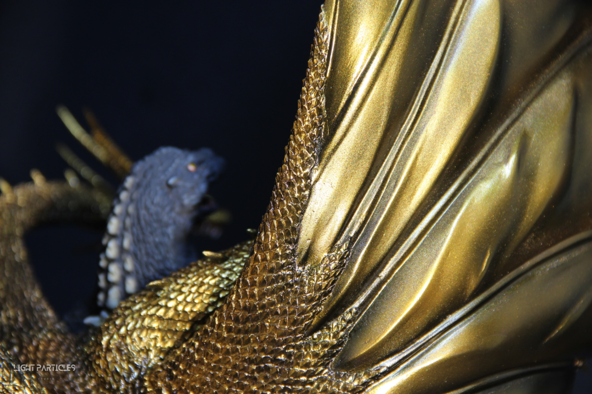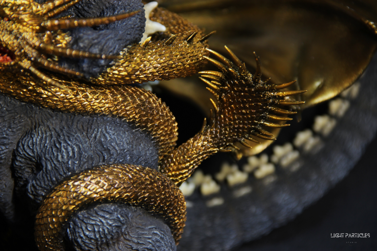 除了將密合度修復外,還需要將基多拉的鱗片進行重新雕塑補齊,把紋理接順,這組套件真的花不少時間在基多拉紋理重製上。最後,根據客戶需求使用銅色系金屬漆對王者基多拉噴塗上色。透過透明色系增加層次外,也用砝瑯漆把層次洗出來,增加整體的厚重感。套件本身翻模的顏色很適合保留下來在牙齒與指甲部位,塗裝後讓這些部位保留半透明感。很開心能把這套經典套件完成,希望大家喜歡~