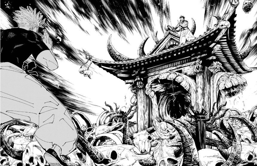 宿儺使出領域「伏魔御廚子」時,身後會出現一個看似廟宇的場景,四處散落著牛隻的頭顱與類似咒靈嘴部的特徵,不論是在漫畫中還是動畫,都表現出一種詭譎又駭人的氣勢。
