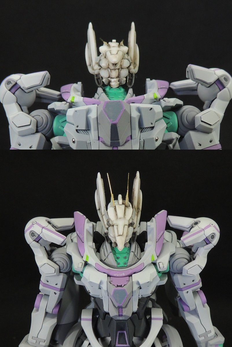 兩邊肩膀上原本是半球狀的零件,改成用壽屋的 M.S.G 塑膠尖刺單元加上補土,重做成錐形,更貼近 GFreD 的樣貌。頭部則是參考設定圖跟動畫播放畫面,用塑膠素材和0.3mm黃銅線親手製作,包括開臉後的模樣。
