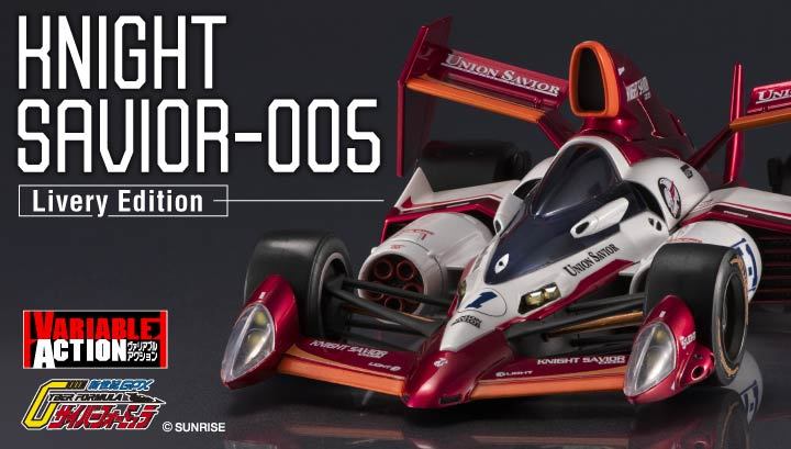 為紀念《閃電霹靂車》30 周年而推出的第五彈「Variable Action 拯夜號 KNIGHT SAVIOR 005 -Livery Edition-」,還原由超音速騎士騎士修馬赫所駕駛的經典賽車。車身以UNION SAVIRO的紅白配色為基礎,整體塗裝色彩變得更為洗鍊、深沉,細節逼真的金屬塗裝也讓車體質感更加寫實;各處的標誌圖樣經過重新設計,呈現彷彿現實中的賽車般帥氣!
