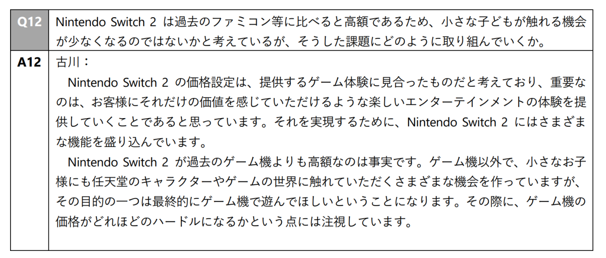 對此,任天堂社長古川俊太郎回應:「我認為 Nintendo Switch 2 的定價,是對得起它所提供的遊戲體驗。我們覺得最重要的,是能帶給玩家們覺得『這真的有價值』的、有趣又好玩的娛樂體驗。為了做到這一點,我們在 Switch 2 上加了很多新功能。」