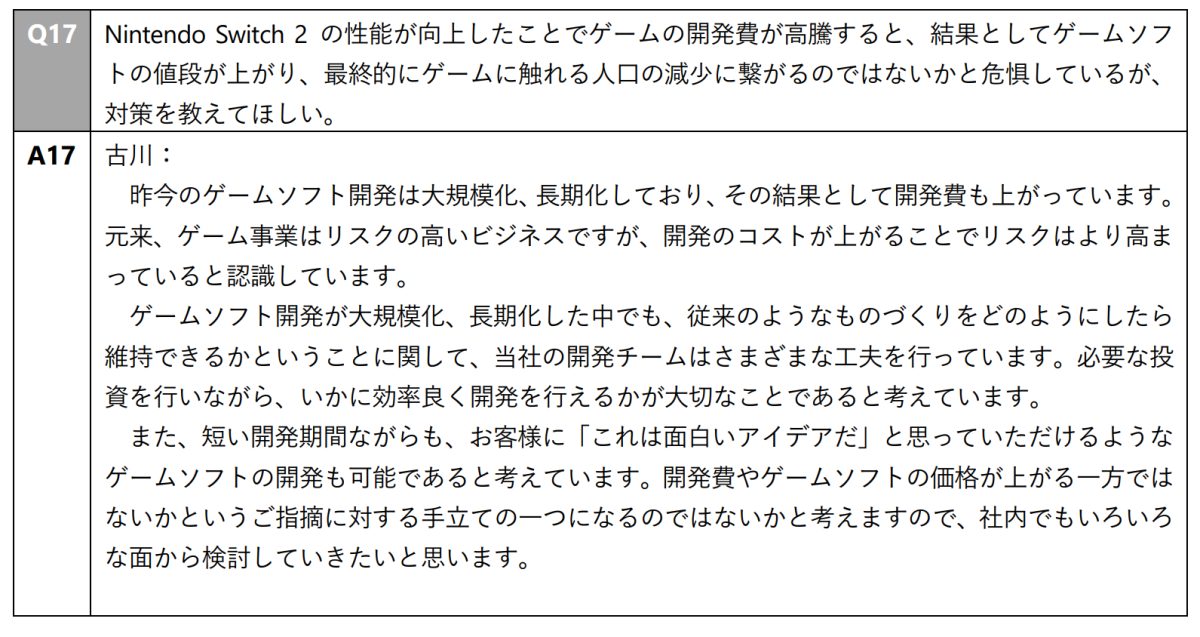 當然後續股東也提出後續問題:「Switch 2 性能變強了,開發成本跟著飆升,會不會導致遊戲賣更貴、進而讓接觸遊戲的人變少?」