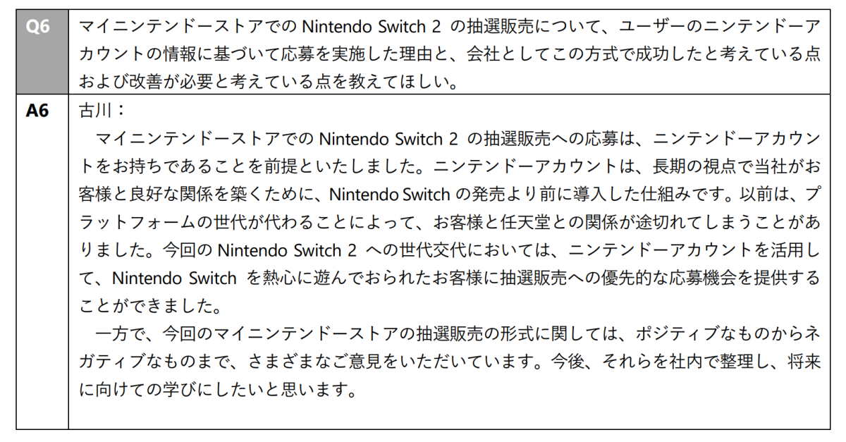 古川社長則解釋:「Nintendo Account 是我們早在第一代 Switch 推出前就準備的制度,目的是想在長期建立起與玩家的關係。以前每次主機換代,都會失去原本的一部分玩家關係,這次我們想避免這樣的情況,讓曾經熱愛 Switch 的用戶,能優先獲得 Switch 2 的購買機會。」