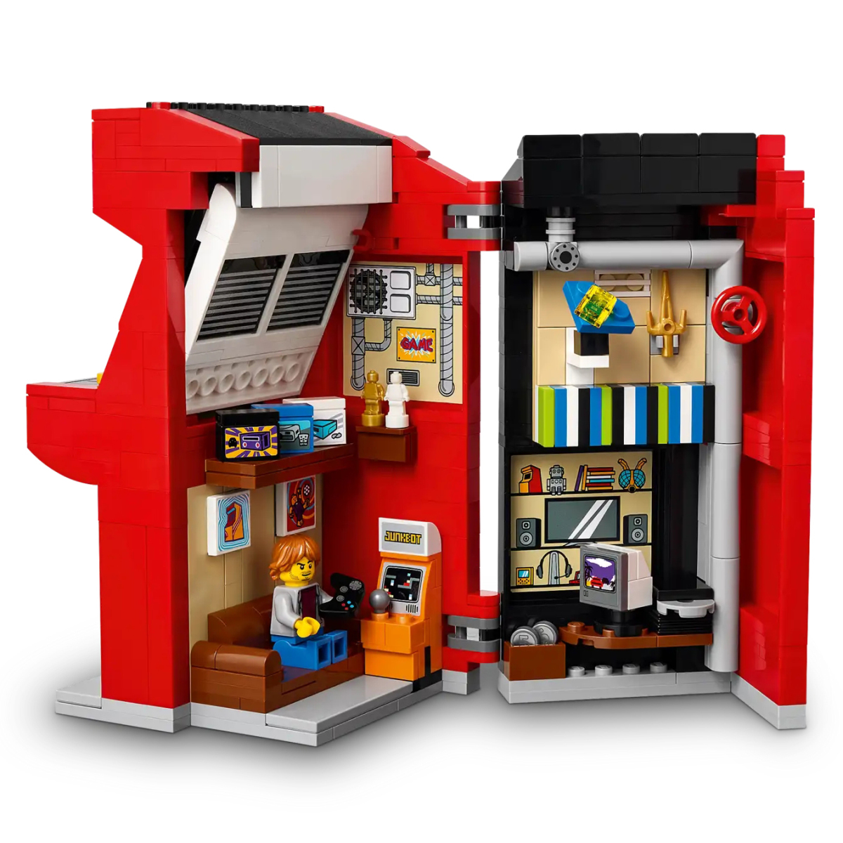 背面可以打開、裡頭隱藏著一間挑高的遊戲間絕對是令人超級興奮的一大賣點!仔細看看,可以發現到原來人偶要搭配的是這一台迷你橘色街機,另外也有架上的各式電玩機台、復古電視機、小編個人猜測是用兩片零件構成的銀河探險家太空船迷你模型,以及注入豐富元素的貼紙。值得一提的是,橘色街機上的 Junkbot 指的是 2001 年在樂高官網上架的電玩遊戲,超酷。