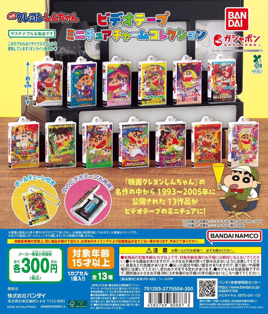 萬代公司轉蛋事業部 GASHAPON 推出以國民動畫《蠟筆小新》為主題的新商品——「蠟筆小新 VHS錄影帶迷你吊飾收藏」轉蛋,參考售價為每轉 300 日圓,預計於 2025 年 07 月第二週發售!