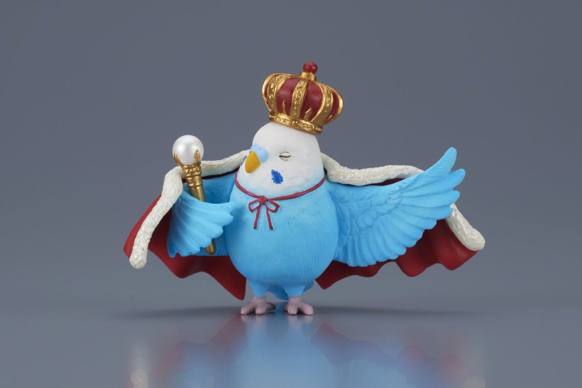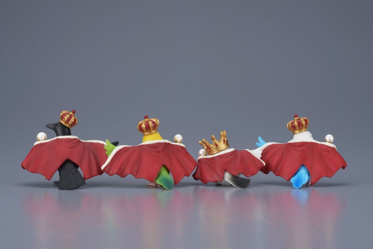 這套轉蛋是以「鳥兒把自己當作王者」的有趣概念為題,並由飼養了鸚鵡的企劃者徹底監修,在 3~5 公分的高度中仔細形塑出鳥類的身形輪廓、羽毛的紋理與漸層色、豐滿的羽翼,以及相當華麗搶眼的王者裝飾!包含王冠、紅色毛皮大衣跟權杖,加上擬人化的逼真動作,真的有種「這鳥王不簡單啊~」的氛圍傳達出來呢!一共有白色圓滾滾的「銀喉長尾山雀之王」、「綠色虎皮鸚鵡之王」、「藍色虎皮鸚鵡之王」跟一身漆黑、散發凜然氣勢的「烏鴉之王」。烏鴉真的超像人!