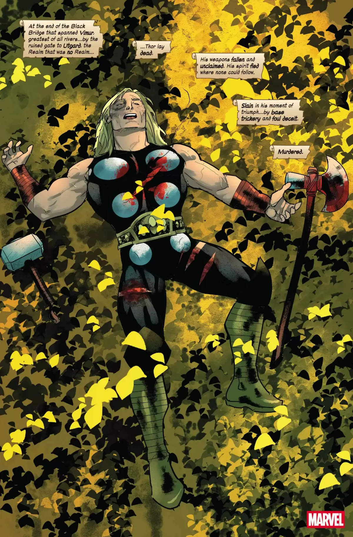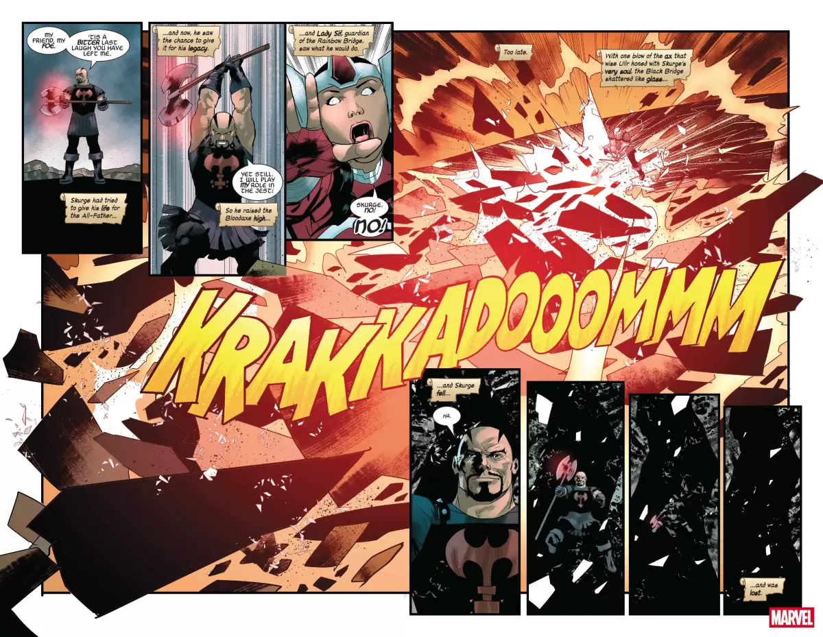 本期劇情中,索爾遭洛基背刺而死,戰友史克奇(Skurge)更摧毀彩虹橋,導致阿斯嘉與地球徹底失聯,歷史與記憶也一併消失。
