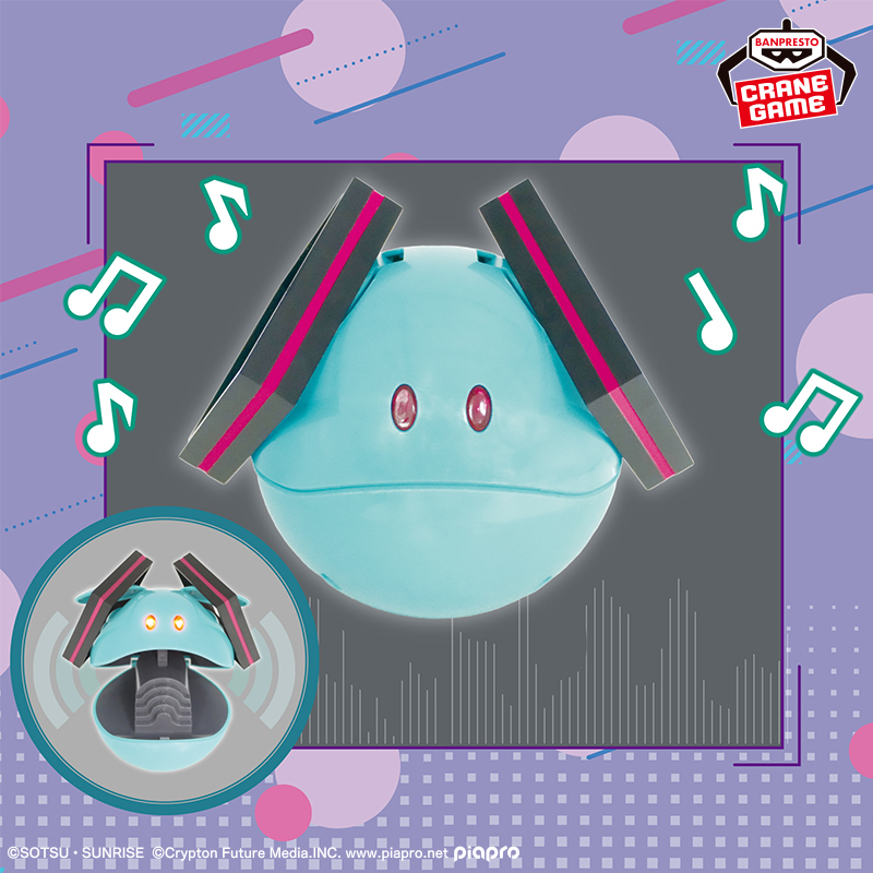 「活力哈囉揚聲器 未來ver.」將可愛的初音哈囉製作成全高約 11 公分高的揚聲器景品,還原特徵的初音綠外殼與兩側方形髮飾,兩側耳朵也能開闔。將身體下半展開後就能露出內藏的喇叭,連接外部裝置播放音訊,是使用時眼睛還會發光!