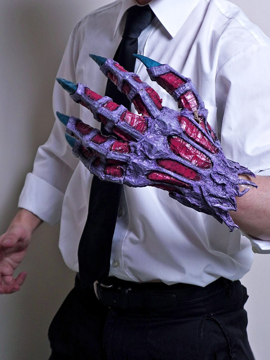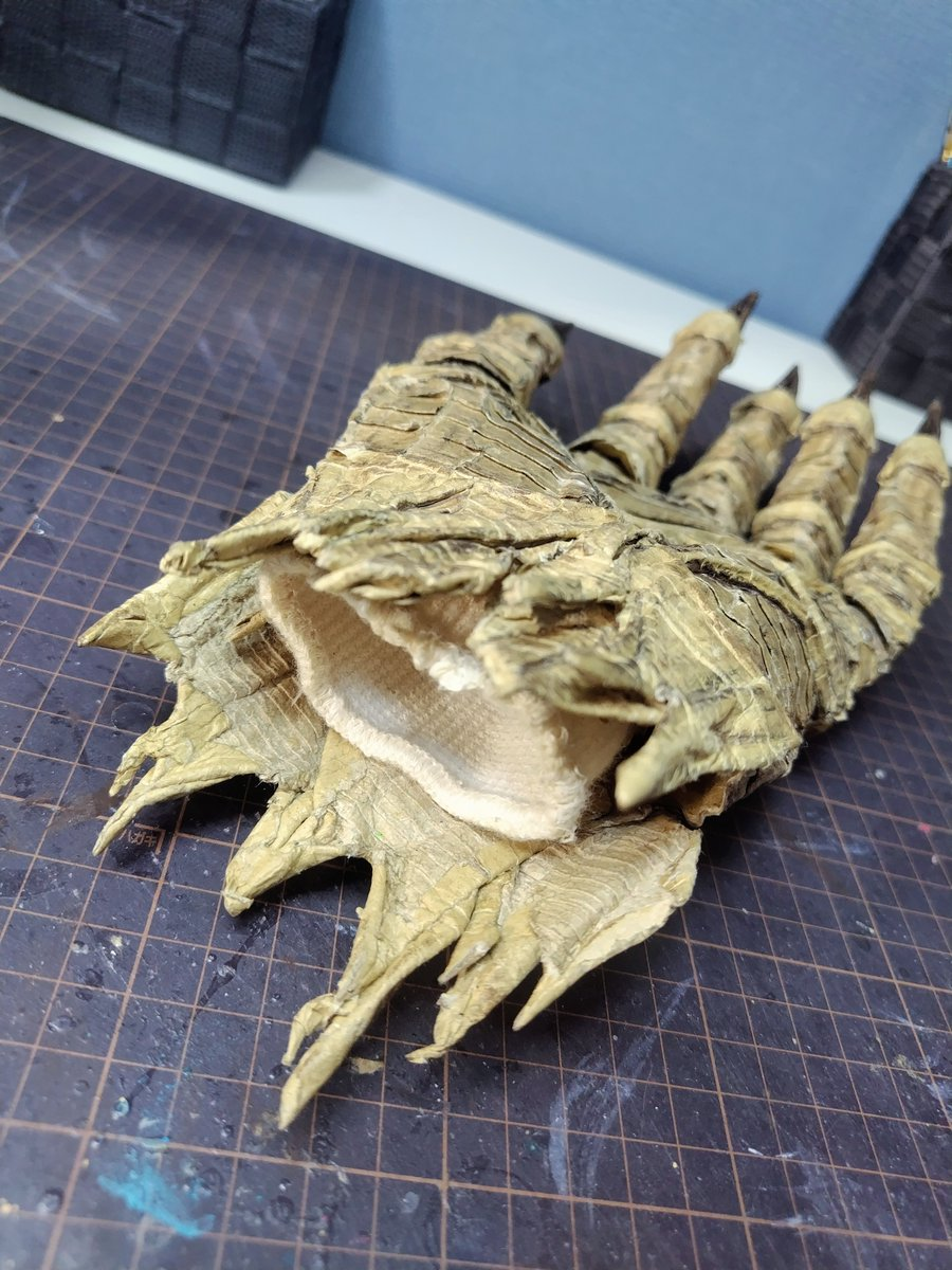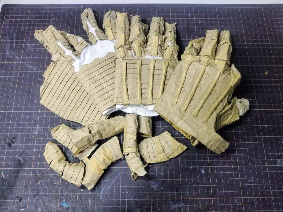 而為了營造鬼手的「存在感」,他在立體感跟真實感上下足功夫。像是手上的肌肉纖維,他用紙箱中間波浪狀的「瓦楞芯」部分去呈現;破損、皺褶也拿來當成細節使用;甚至還用不同種類的亮光漆,再搭配乾刷技巧做出陰影效果,看起來超有份量感。從各種角度看過去,根本看不出來是紙箱作品!