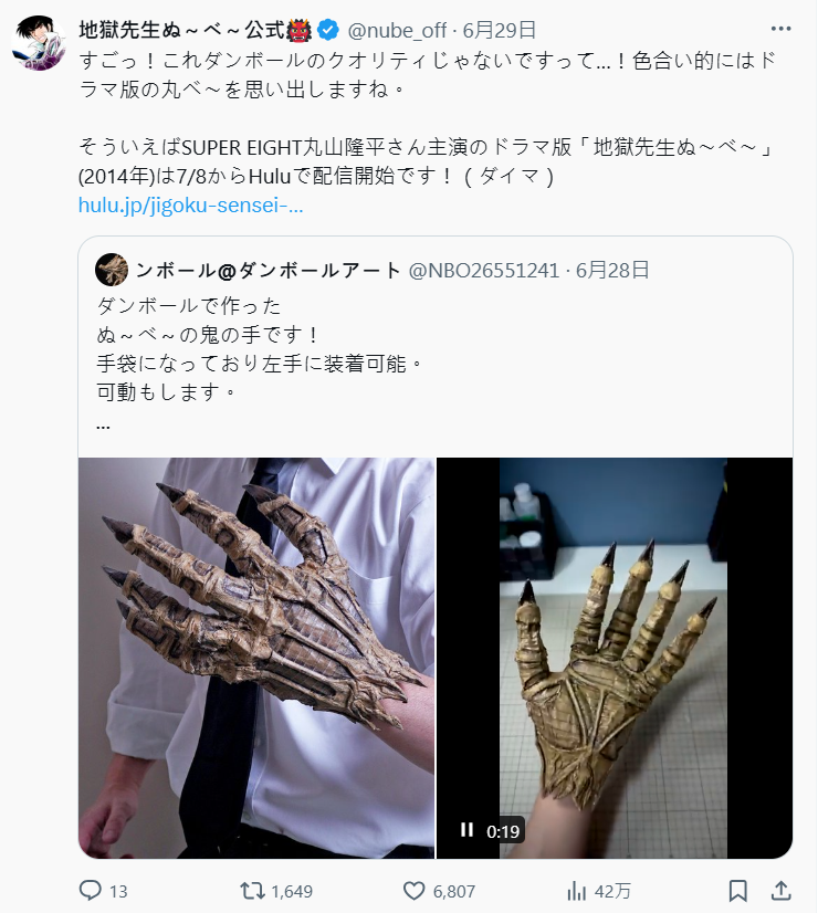 這麼狂的作品也讓網友們紛紛朝聖留言:「手跟手臂的交界處處理得好強……」、「這竟然可以穿戴還能動,怎麼可能是紙箱啦?」連《地獄老師》的官方帳號都特地來留言回應,稱讚這就是「鬼」等級的作品!