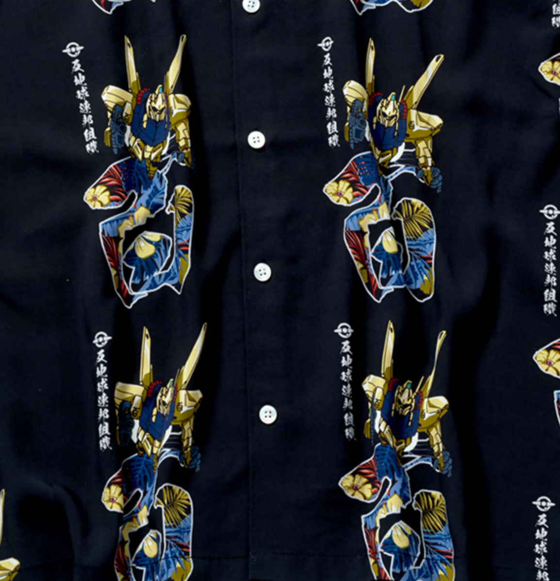 以黑色為基底,可以看到上面有著以「百」文字結合扶桑花背景的夏日圖騰,讓漆黑的襯衫完全不低調。加上百式機體的圖案跟文字「反地球連邦組織」,滿版呈現出黑金搭配的獨特風貌。