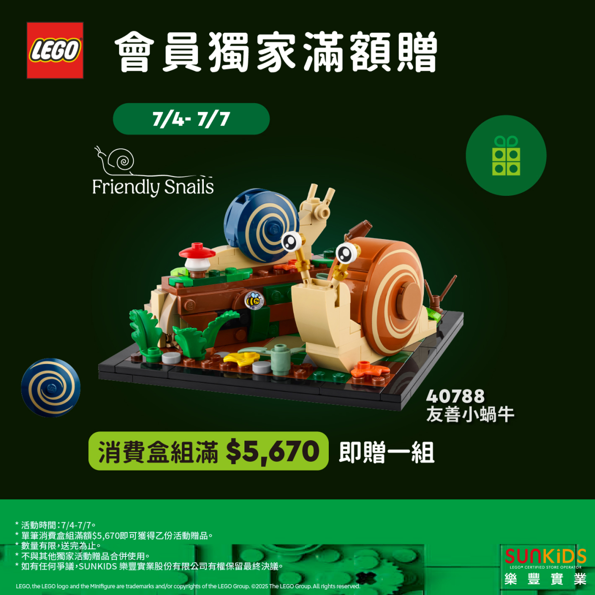 這一款滿額禮的入手方式為 7 月 4 日~7 月 7 日這段期間,於台灣樂高授權專賣店消費滿 5,670 台幣即可免費獲得;不過時間稍短,想要一次入手新品跟這次可愛小蝸牛的玩具人要把握一下時間喔。