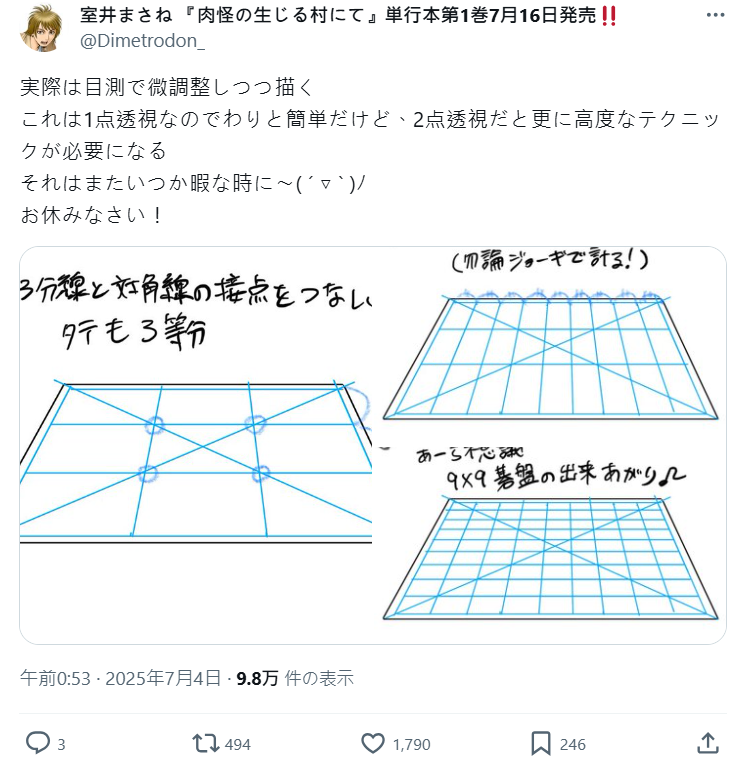 室井老師也大方分享了自己的「手繪棋盤技術」,包括如何用單點透視畫出精準角度的棋盤格子,並強調這招還能應用在畫大樓窗戶、拉門等場景。但他也開玩笑說 : 「雖然對現在的電繪畫畫世代來說可能用不到了啦 XD」,不過這些技術後來也成電繪的技巧之一,其實也並非沒有幫助。