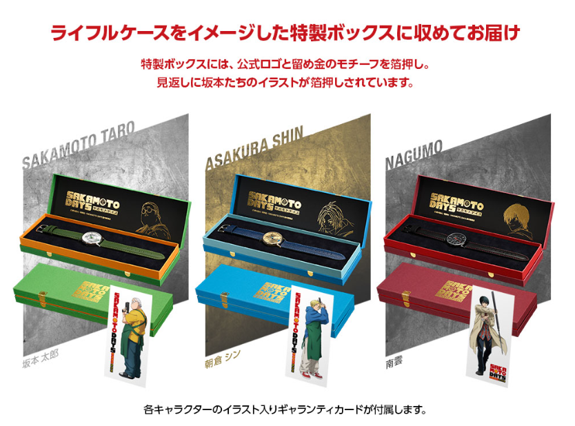 而且這系列手錶會用「狙擊槍收納盒」風格的專屬包裝盒寄送,裡面還附有角色插圖的保證卡,供粉絲收藏。