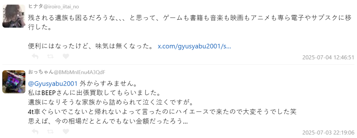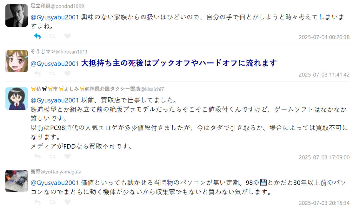 然而,也有實際處理過宅物的人指出殘酷現實:「大部分都會流到 BookOff 或二手買取店了啦」、「只要是軟碟版的老遊戲,現在都不收了」、「沒當年能運作的電腦,這些收藏也只能放著積灰」。