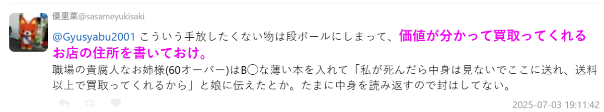還有趣味回應也出現,有位網友分享:「我60幾歲的女同事,把 BL 薄本裝箱,交代女兒:『我死後直接寄這間收購店,裡面不要打開看,運費他們會出』,聽說現在還會偶爾拿出來翻翻所以箱子沒封起來。」