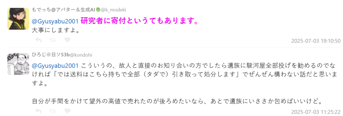 部分網友則建議可將收藏轉交給博物館、研究機構或主題商店:「如果有遊戲收購店合作的就叫他們來載」、「可以用生前估價的方式,避免寶物變垃圾,也能讓家人少點困擾」。