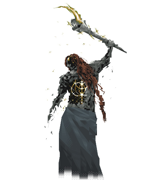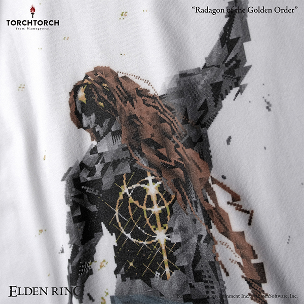 這款T 恤是以「拉達岡」為主題,採用寬版剪裁設計,由像素藝術家ヘルミッペ / Hermippe ( @komiya_ma ) 親自繪製,重現他舉起大槌、回眸的經典背影。將破碎、龜裂的身體透過像素風格做出幾何感十足的細節處理,格外具有特色。