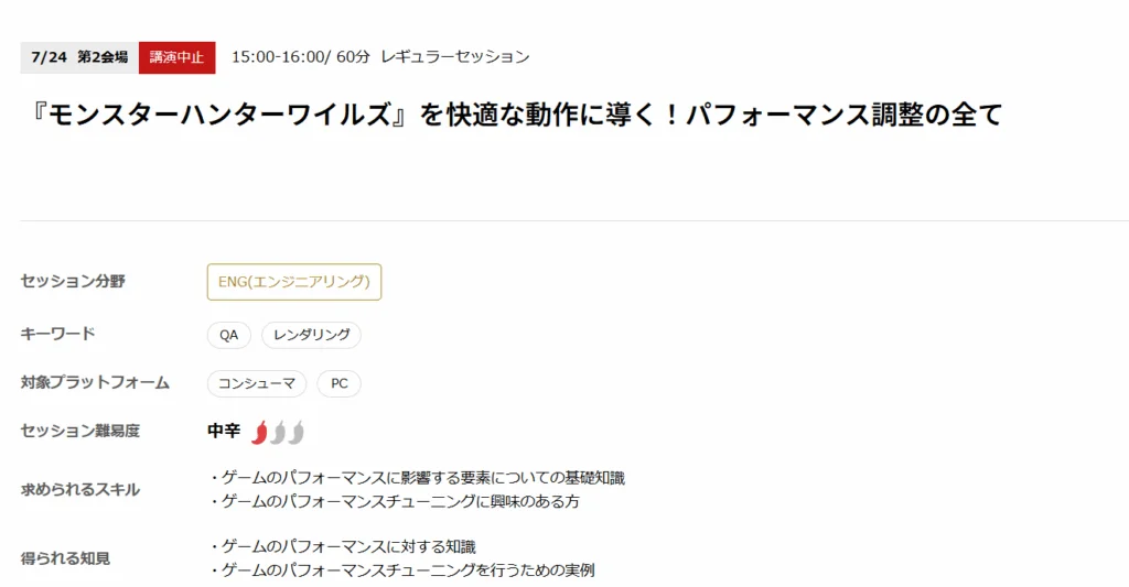 原本的講座標題是「讓《魔物獵人 荒野》跑得更順暢!效能調校完全解析」( 『モンスターハンターワイルズ』を快適な動作に導く!パフォーマンス調整の全て ),由卡普空預定在 7 月 24 日舉行。儘管這場講座臨時喊卡,不過像是「魔物獵人系列21年持續熱賣的秘密」( モンスターハンターシリーズ 21年の継続と仕掛け ) 等其他場次仍會照常舉辦。