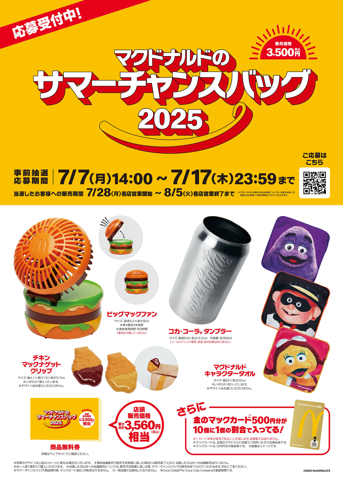 然而日本麥當勞也不惶多讓,從今日 ( 7/7 ) 起,開始透過官方 App 接受「2025 麥當勞夏日機會包」的抽選預購申請。這款夏季限定福袋裡面不只送你 4 樣超可愛的原創周邊,還有總價值最高達 3560 日圓的免費餐券,整包賣 3500 日圓,也吸引大量消費者抽選參與。