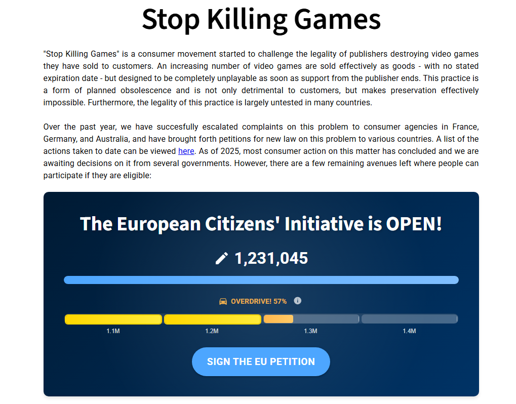 由玩家發起的「停止終結遊戲」(Stop Killing Games)倡議,近日在歐盟公民連署中突破百萬門檻,正式有機會推進至歐洲議會公開聽證或辯論階段。
