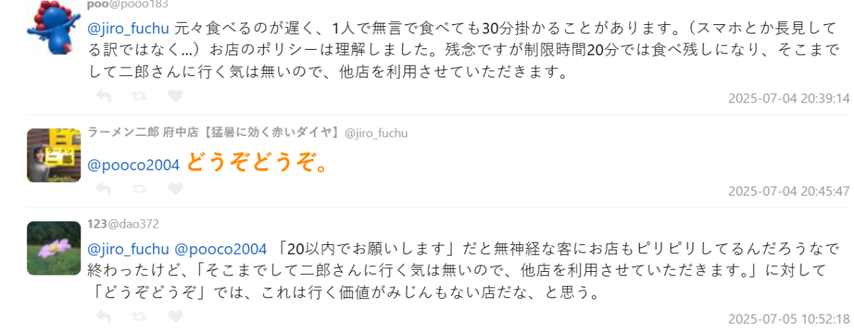 當然,拉麵二郎一向有其特殊的用餐文化與流程規則,能接受的人大有人在,要不然也不會各家店都常常人滿為患,不過這次「限時20分鐘吃完」炎上爆炸,或許也讓店家思考該如何約束客人過往「滑手機吃很慢」造成出餐的困擾,應該有更好的作法與表達方式。