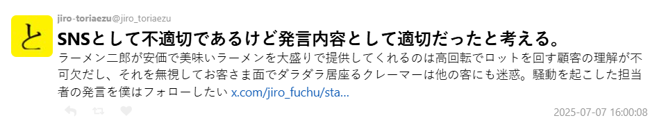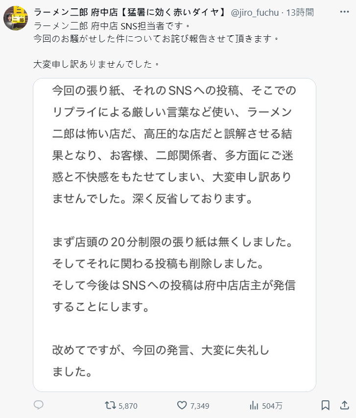 這次關於張貼公告,以及我們在 X 上的發文,還有對留言的回覆中用了比較強硬的語氣,讓大家產生「拉麵二郎是家很兇、壓力很大的店」這種誤解,結果造成了客人、二郎粉絲,還有很多相關人士的不安與困擾,我們真的很抱歉。對此我們深刻反省。