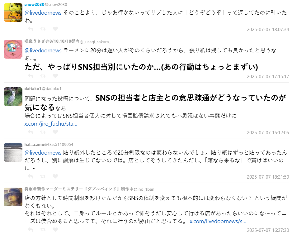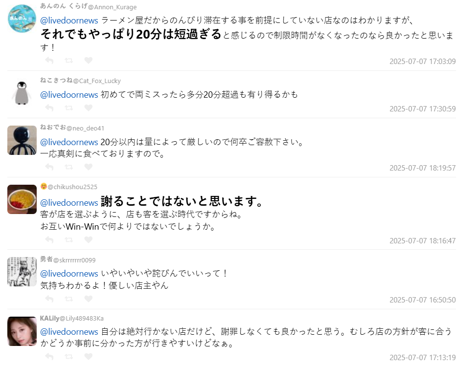 同時也有支持店方的聲音出現,一名網友直言:「拉麵二郎靠的是高翻桌率才能維持份量大又價格實惠的經營模式,拖時間的客人會影響整個節奏。」,即使自己不會去用餐,但只要顧客可以接受,其實也沒什麼大不了。