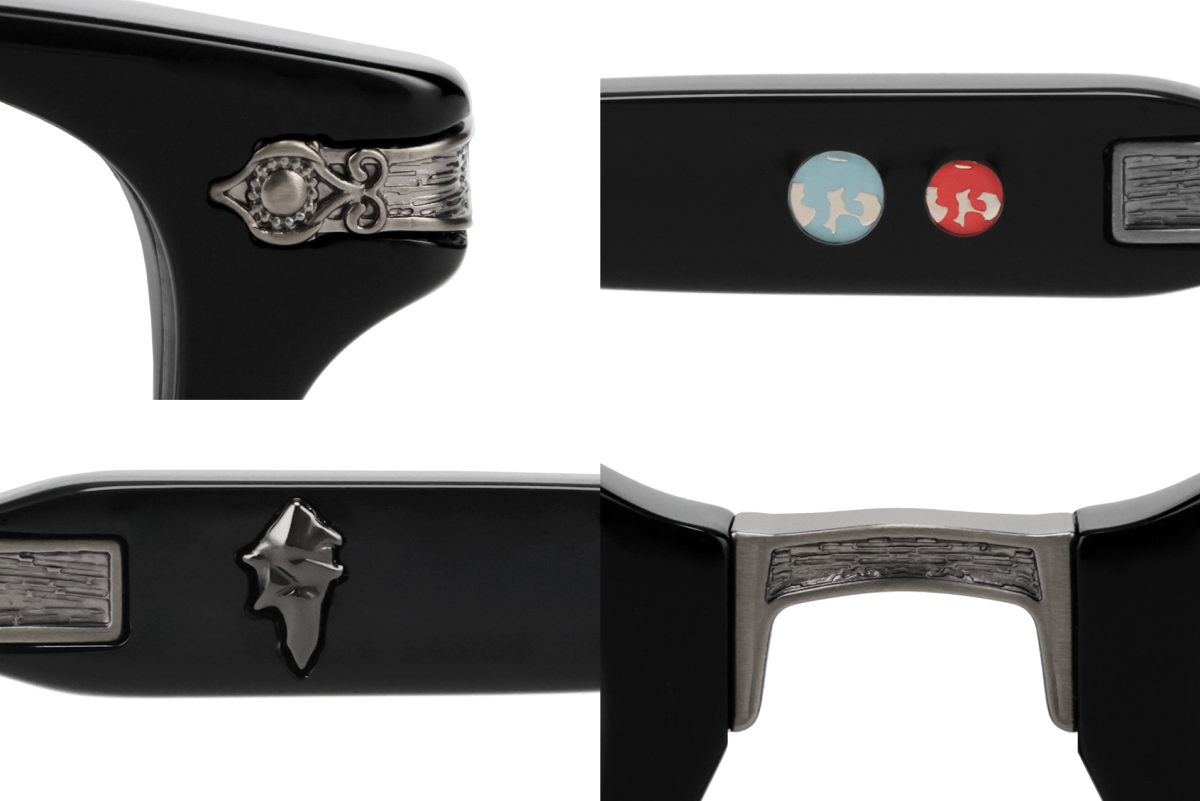 鏡框正面兩側設計成比比的眼睛,鉸鏈部分則加上他的帽子、外套、袖子的意象金屬件,還原度相當高。