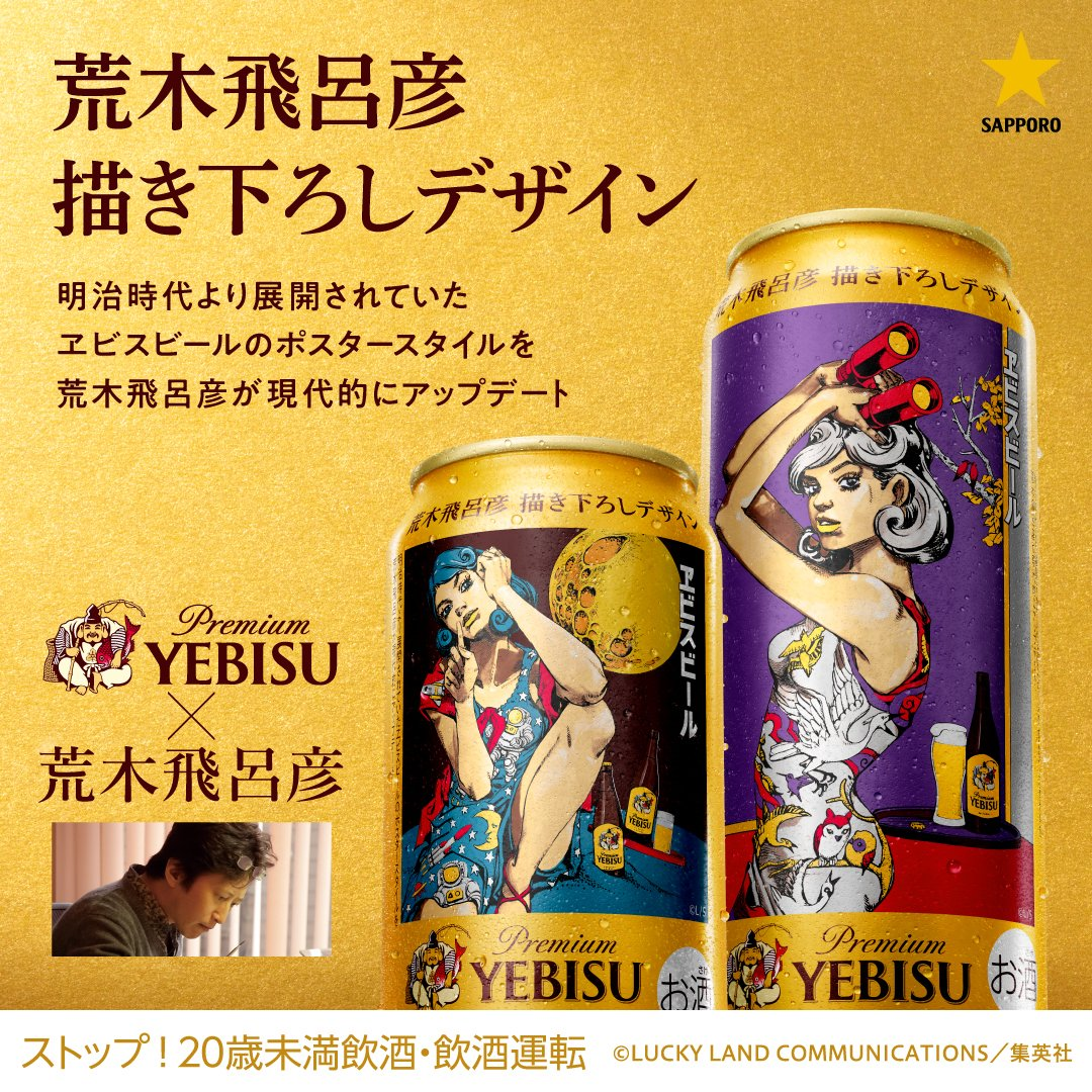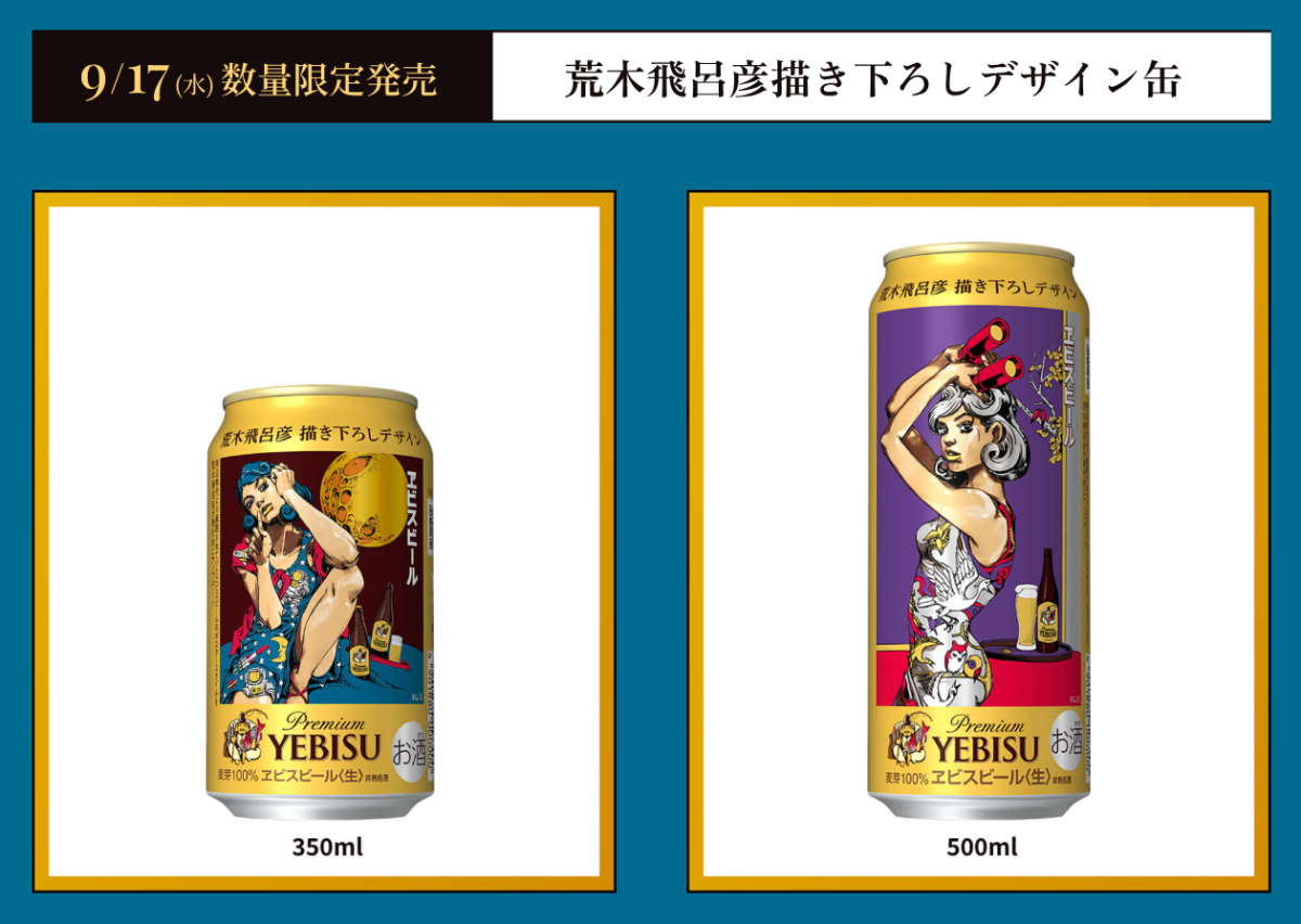 這是荒木老師與恵比壽啤酒的第二次合作。而這次第二彈的主題則是「洋裝美人」,進一步將時代感升級,經由荒木老師重新詮釋、畫出獨具荒木風格的設計,呈現出另一種風貌的華麗設計。將於 2025 年 9 月 17 日起在日本全國限量發售,分為 350ml 和 500ml 兩種容量 ( 不同圖案設計 )。