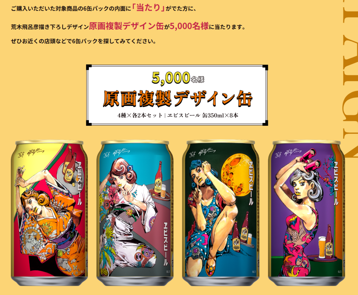 1. 抽選活動,有機會獲得「荒木飛呂彥繪製原畫複製版啤酒罐」的限量組合(共 4 款,每款 2 入的套組)。