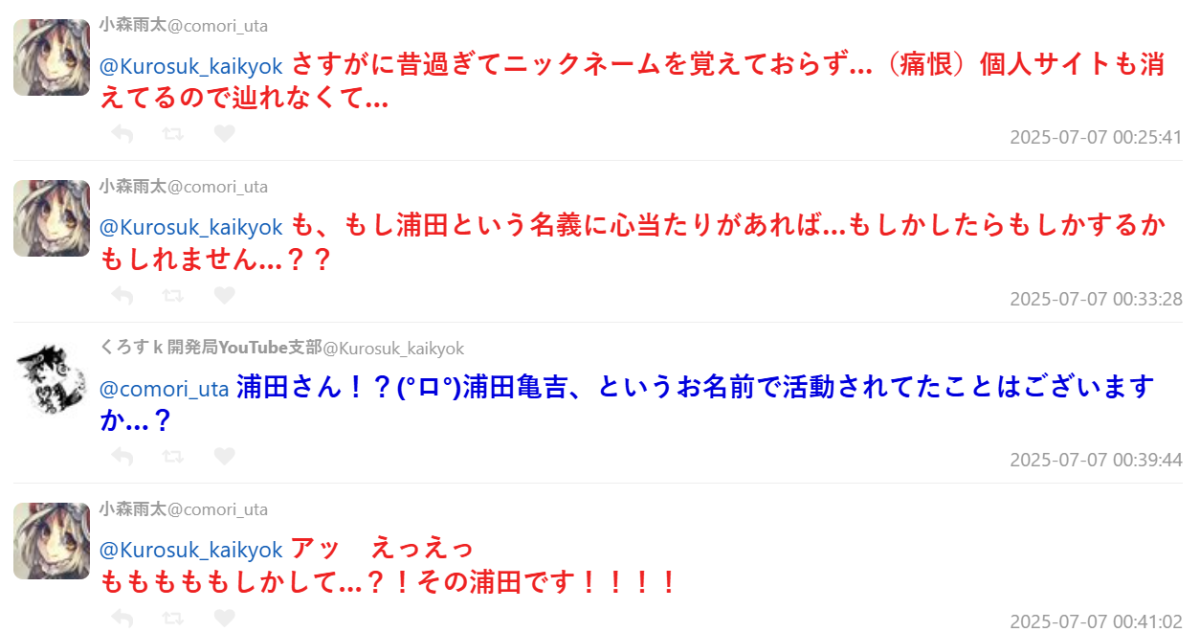 這句話瞬間喚醒兩人記憶,推主認出對方過去在網路上使用的名字「浦田」,而くろすk也確認自己正是當年收下那隻「マリア」天然雀的那位朋友。兩人18年後意外在社群平台上重逢,讓許多網友直呼感動。
