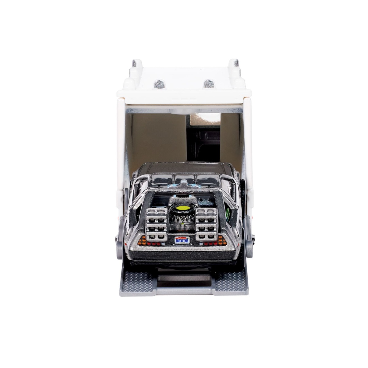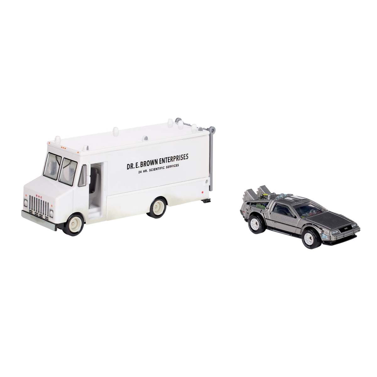 本次的《回到未來》40 週年紀念壓鑄合金汽車套組採用的是電影中 1985 年 10 月 26 日凌晨馬蒂和博士相約 1:15 在雙橡商場前會面的場景,收錄用來載迪羅倫時光機的、印有「布朗博士企業 全天候服務」(DR E. BROWN ENTERPRISES 24 HR. SCIENTIFIC SERVICES)字樣的貨車以及迪羅倫時光機本體,在合金小汽車的比例下細膩的還原兩台車輛在劇中的造型。迪羅倫時光機可以被裝載在貨車的車廂中,開啟車廂便可以將時光機向後滑出,再現迪羅倫時光機初登場的經典場面!