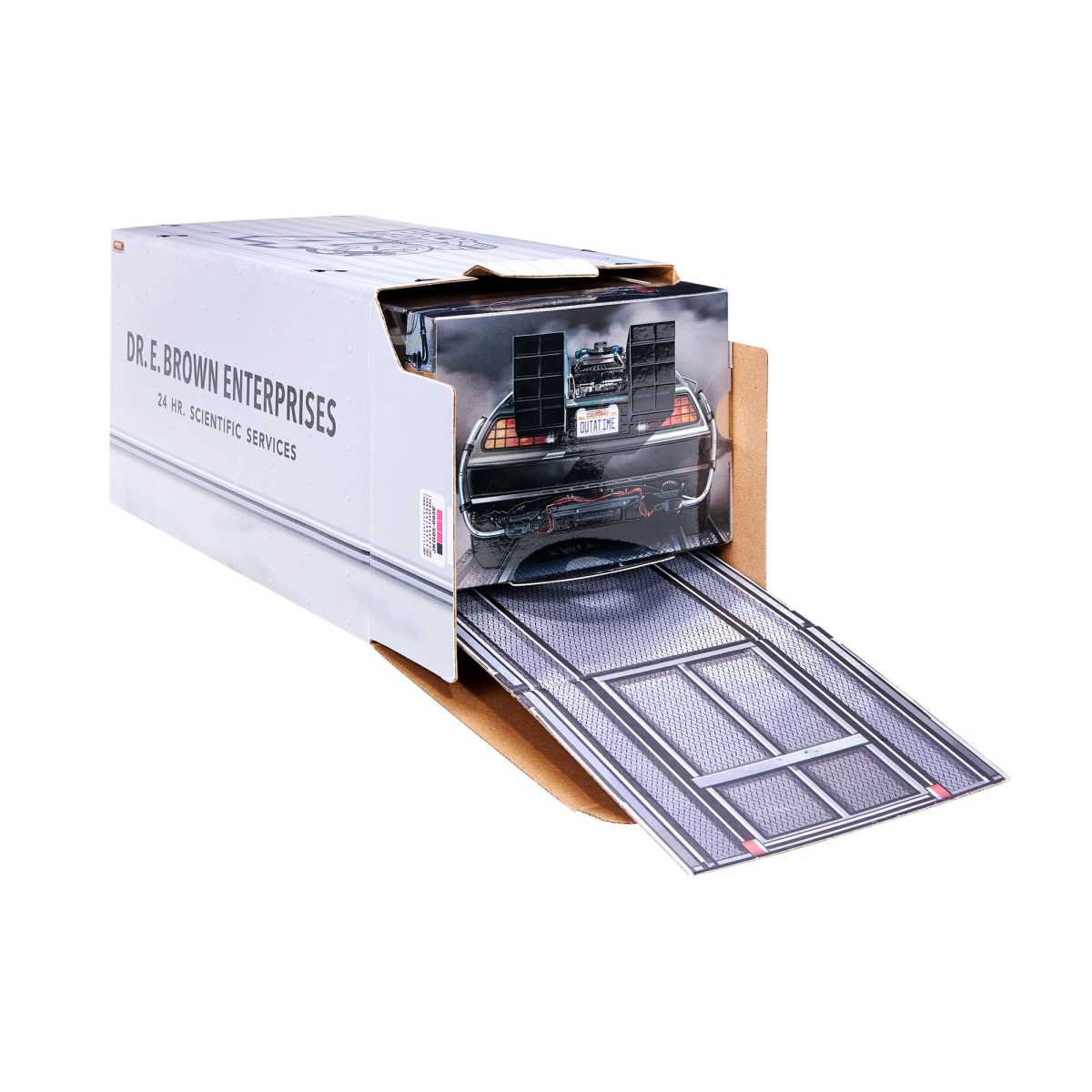 包裝盒的部分作有兩層,內層製作開窗的設計,內部印刷重現了雙橡商場停車場的場景,外部則印製了迪羅倫時光機的車頭與車尾造型,而外層的包裝則是還原了貨車的造型,讓開箱的過程也有著將迪羅倫時光機從貨車中取出的體驗!