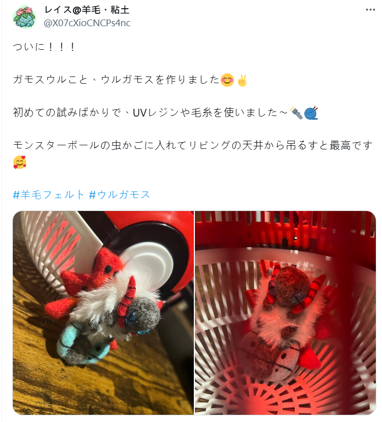 像是玩家レイス會用羊毛氈手作寶可夢「火神蛾」,為了防止家裡的貓咪搗蛋,她就把火神蛾放進精靈球蟲籠裡,掛在天花板上展示。她甚至還把其他角色的「蛋」放一起,營造火神蛾在孵蛋的情境,趣味滿滿。