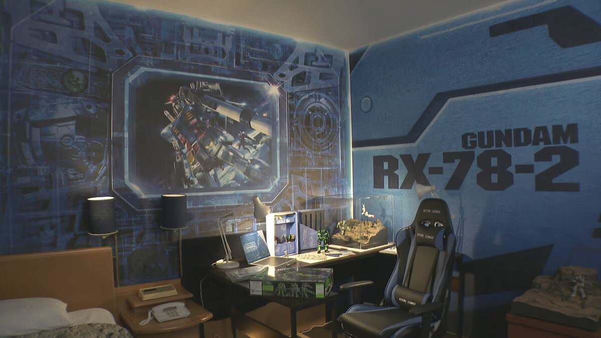 房間內具有獨家牆面藝術設計,還提供環繞式「駕駛艙風格」專業的鋼普拉模型工作檯讓你組裝,房內還有展示用鋼普拉立體場景。房價為一晚含早餐 45,000日圓,1~2人入住都一樣。