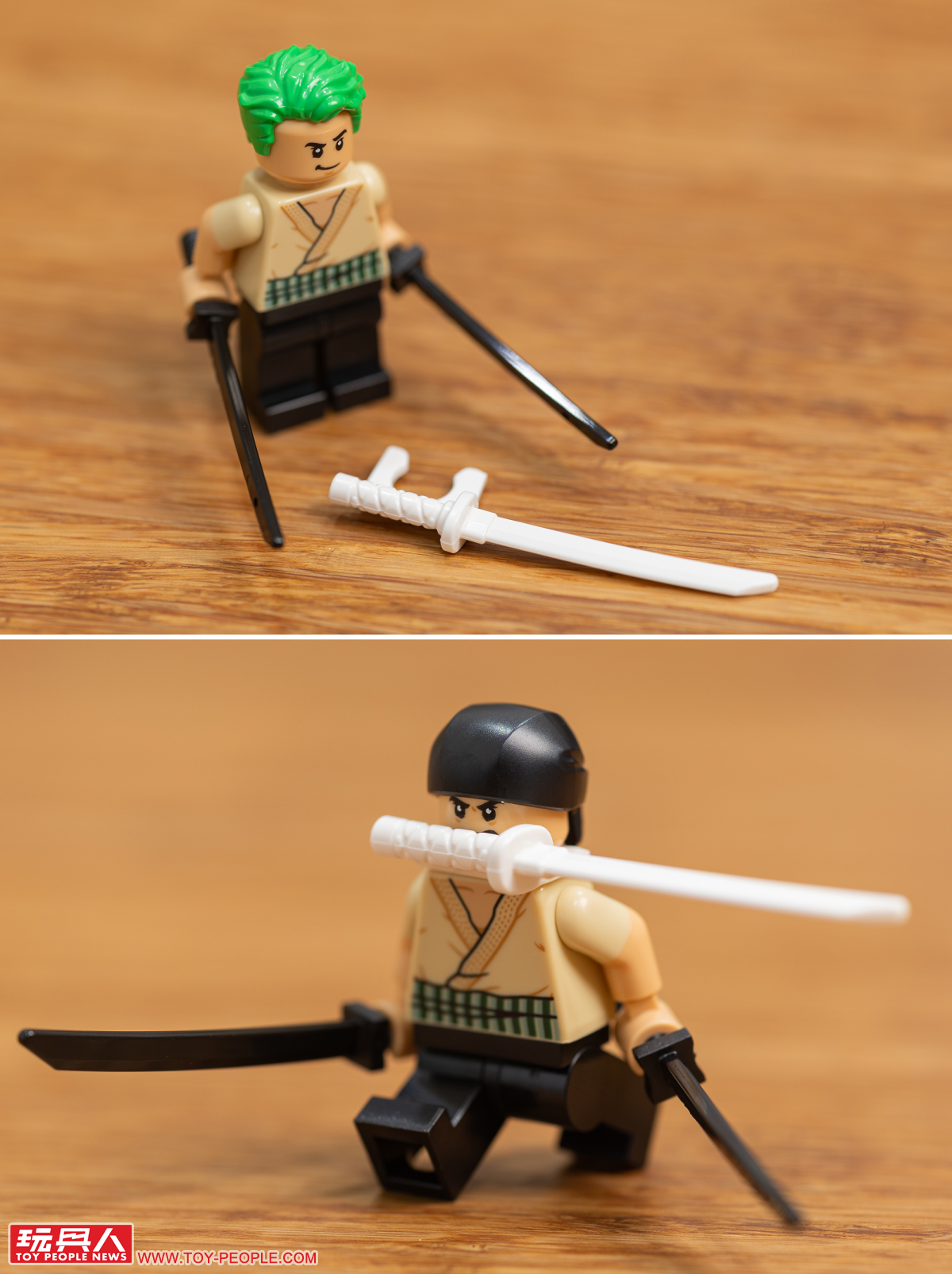 ▼ 在樂高當中也能還原索隆的三・刀・流!!採用特製規格打造、呈現白色的和道一文字能夠直接扣在脖子上,不用先把頭拆下來,拆裝起來相當直覺方便,搭配額外的黑色頭巾就能重現劇中場景啦!