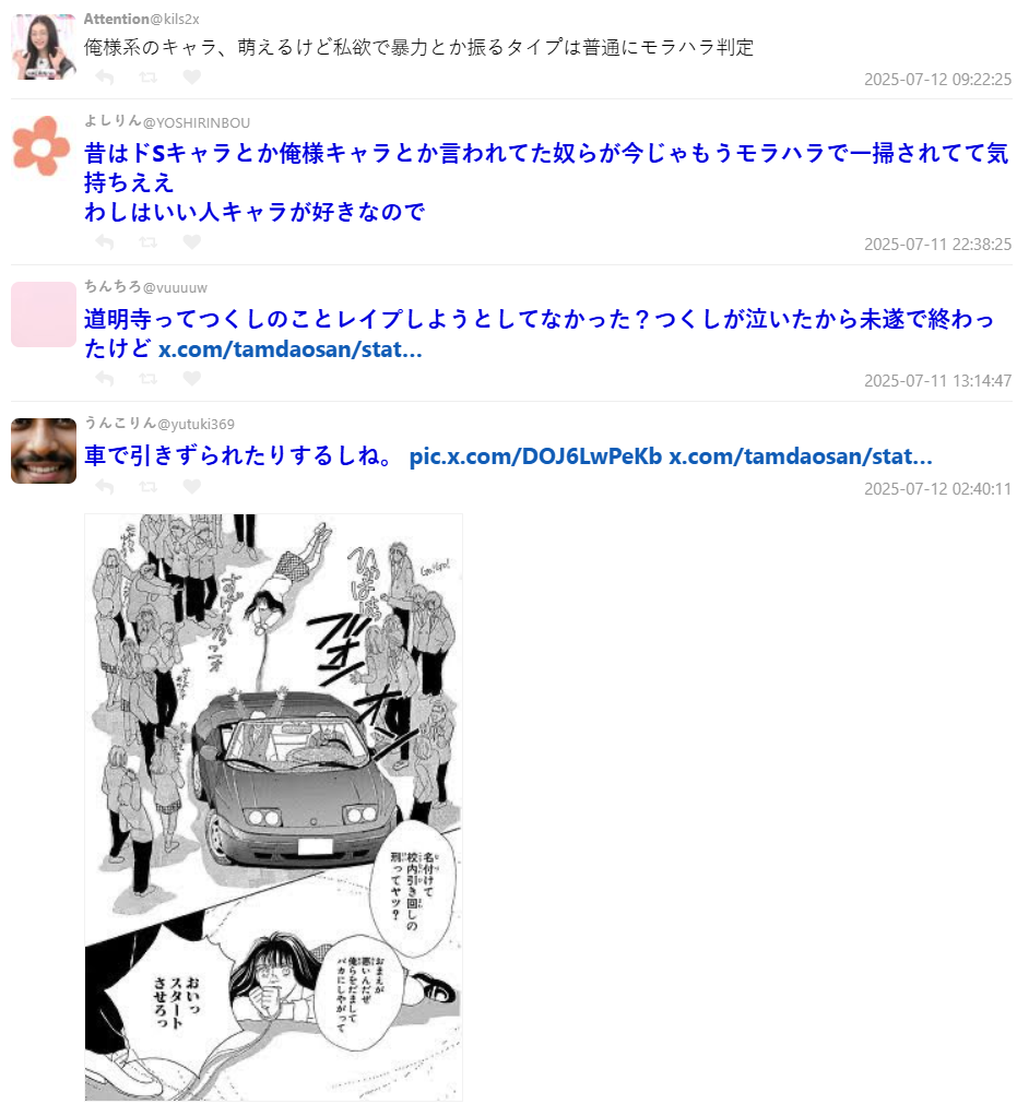該發言迅速引爆關注,許多網友也紛紛加入戰局,翻出各種誇張情節,包括想對女主角杉菜性侵、將她綁在車上拖行、在學校裡發動全校霸凌等,直呼「怎麼會愛上這種人?」,也有網友指出「那種暴力傲嬌角色,其實就是後來那種暴力系傲嬌女主的祖師爺,只是性別顛倒。」