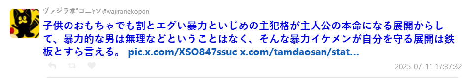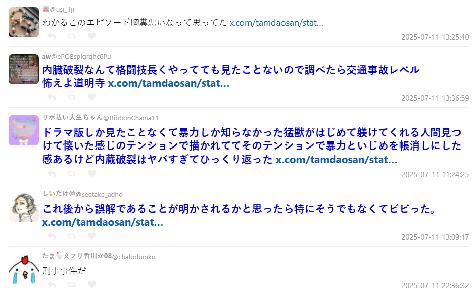 也有網友表示:「這段踢到內臟破裂的劇情,我在格鬥技都沒看過,這已經是交通事故等級了吧,道明寺真的太恐怖。」另一人更無法接受原作將這種行為包裝成戀愛劇情,怒批:「這不是霸凌,是暴行,是刑案吧?」