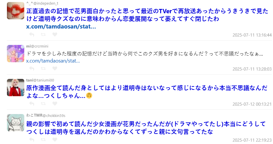 也有不少人感嘆當年看電視劇時完全沒意識到原作這麼黑暗:「以前只看過電視劇,以為道明寺只是有點暴躁,沒想到原作這麼獵奇,內臟破裂是怎樣?」有網友更戲稱:「這根本是披著制服的黑道片。」