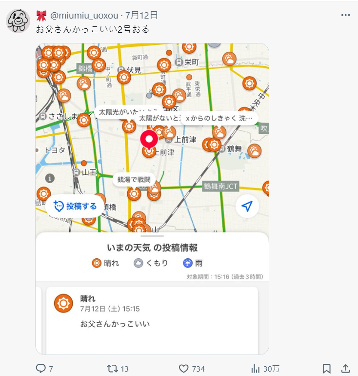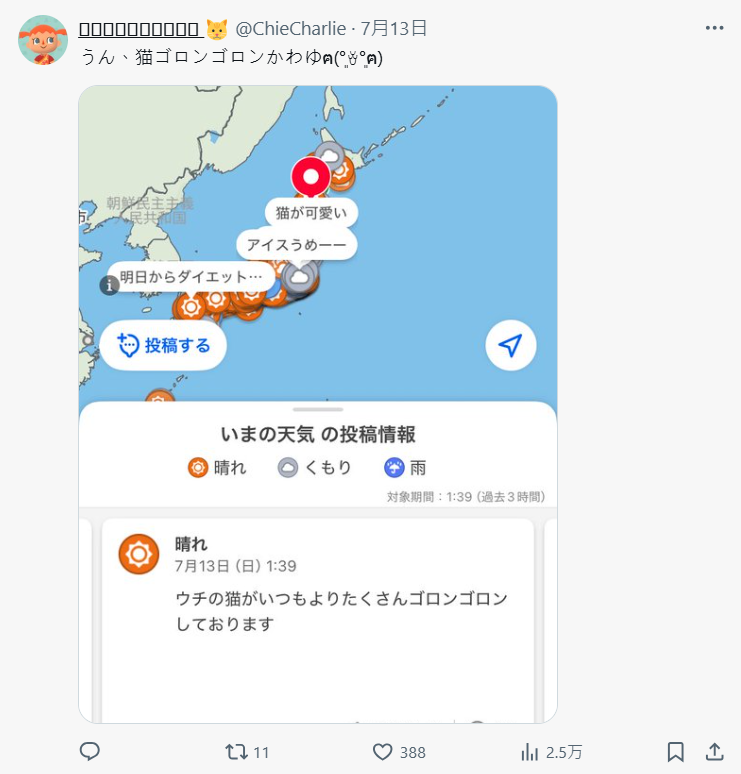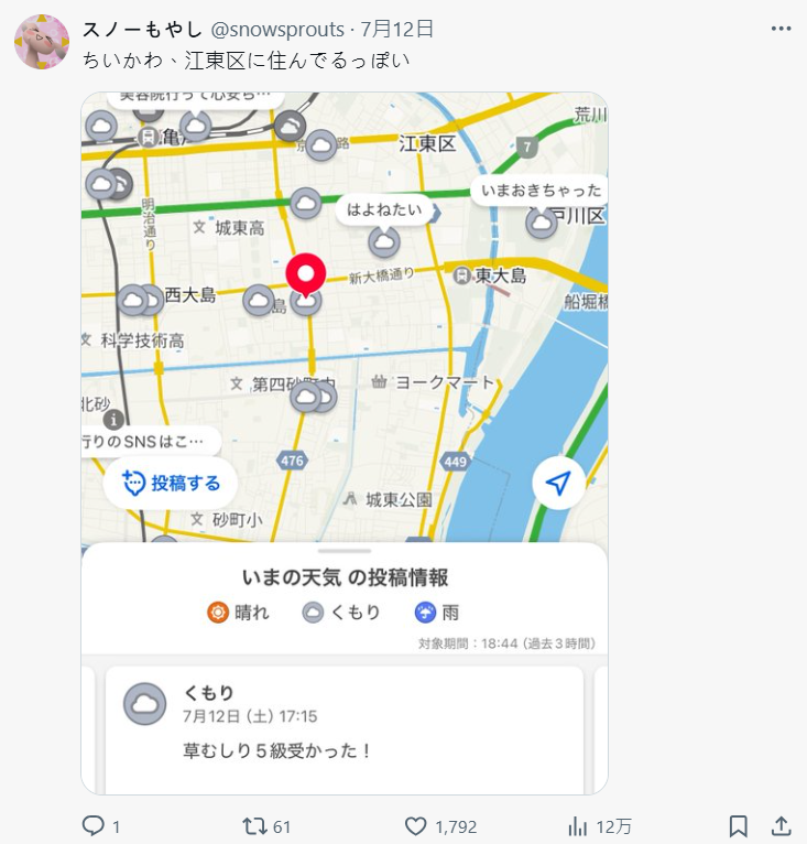 這款 App 有項功能叫「みんなの投稿」 ( 大家的投稿 ),本意是讓使用者可以附上當地的天氣狀況留言、分享。但現在越來越多人開始無視天氣,直接在上面寫些「我不想上班」、「今天好懶」、「最近喜歡吃冰」這種生活雜談,甚至互相聊天,畫風超日常、超鬆,反而被一票網友稱為「這才是理想的社群平台」。