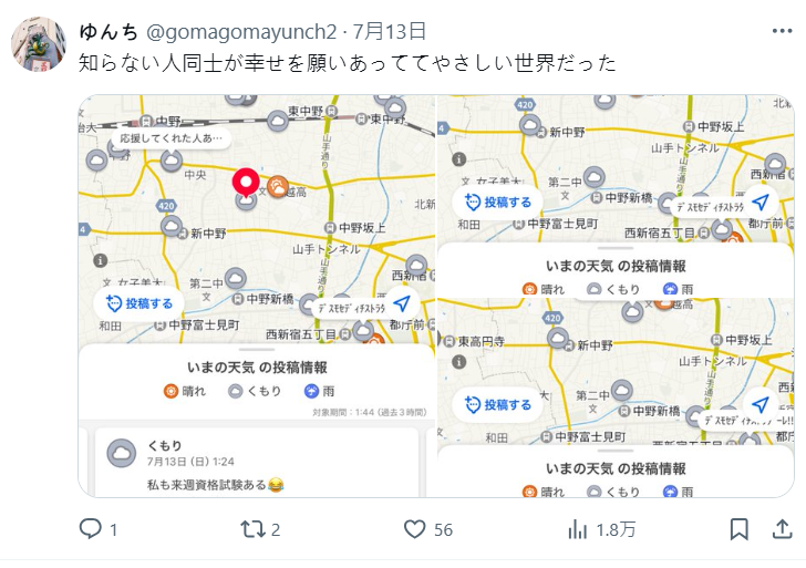 只看留言就能讓人看得津津有味,整體氛圍超像以前那種沒有壓力的早期 SNS,尤其因為還有地圖定位的功能,變成可以看到各地的網友都在分享心情,讓不少網友認為這樣的社群型態更加有趣,掀起不少日本網友進去遊玩。
