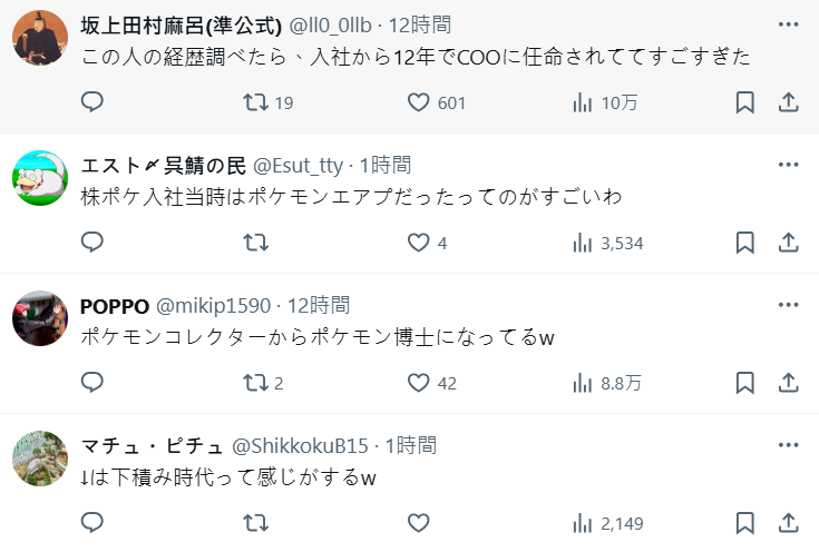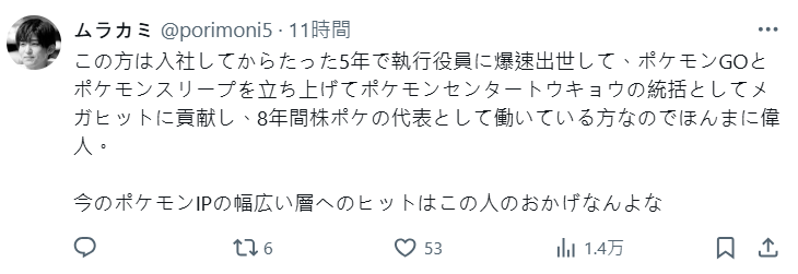 更有網友指出,宇都宮崇人從 2005 年加入「寶可夢公司」到升上執行董事只花了 5 年,還主導了《Pokémon GO》和《Pokémon Sleep》的企劃,讓「寶可夢中心東京」業績大爆發。接著當了 8 年的寶可夢公司代表,在 2017 年入社 12 年就成為執行長 & 代表董事,真的就是個不可思議的神人。現在寶可夢品牌能打進這麼多不同族群的市場,真的是多虧他。