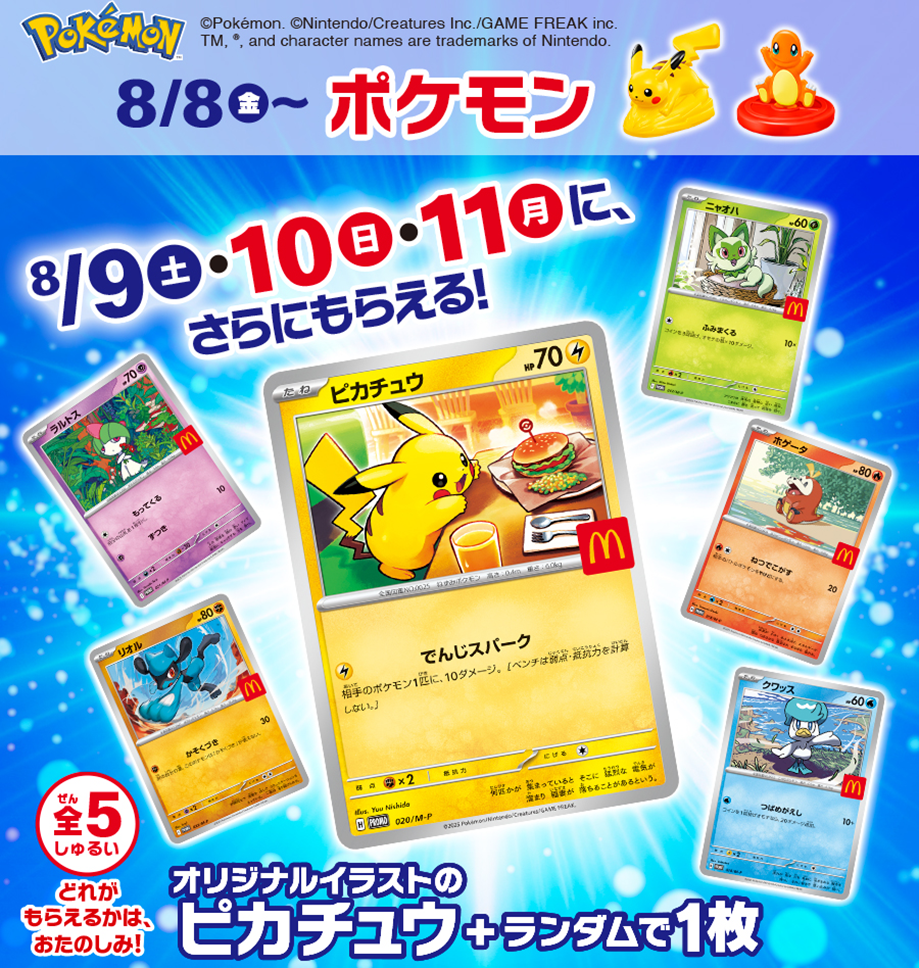 根據目前官方的預告,將會從 8 月 8 號起,快樂兒童餐將會附上《寶可夢》的玩具,然而 9 號到 11 號之間,將還可以拿到限定的寶可夢卡牌,全部都是麥當勞合作的原創繪圖,確定購入將會有「一張皮卡丘 & 五張卡牌任一」,一套兒童餐共計可以獲得兩張卡片。