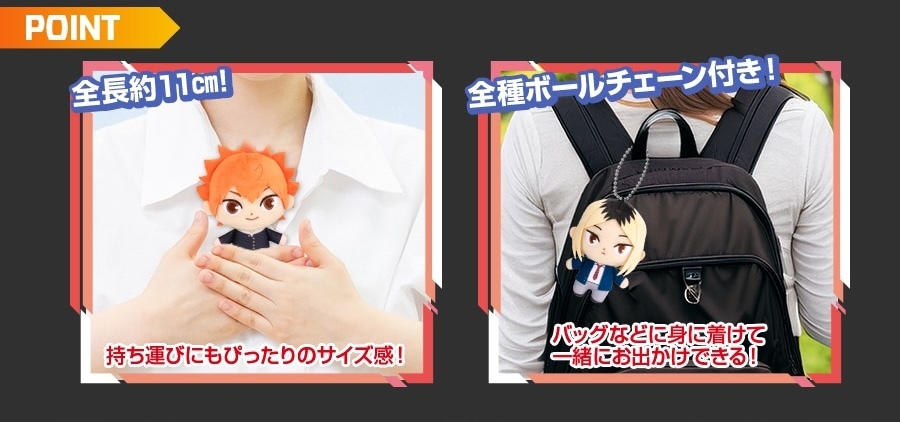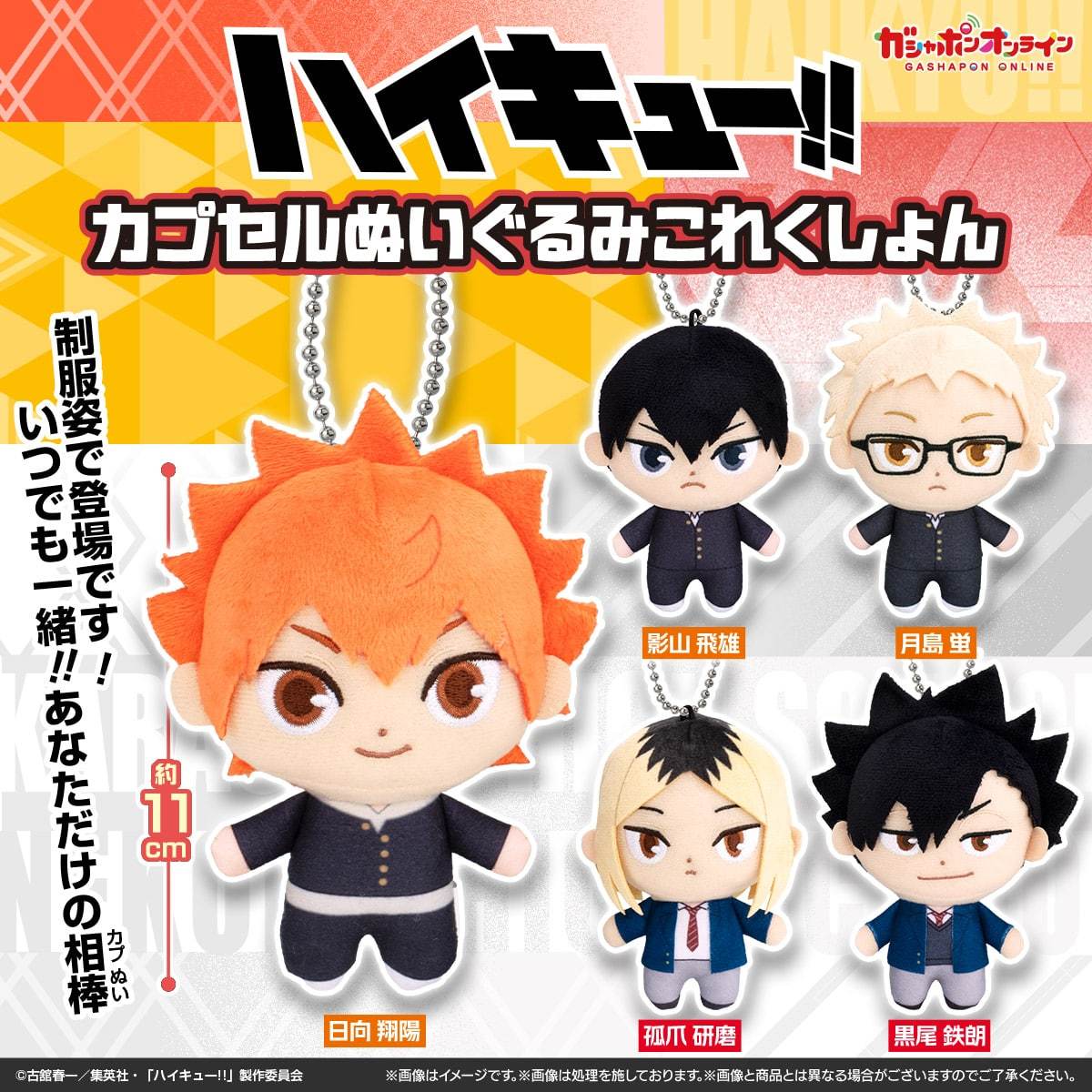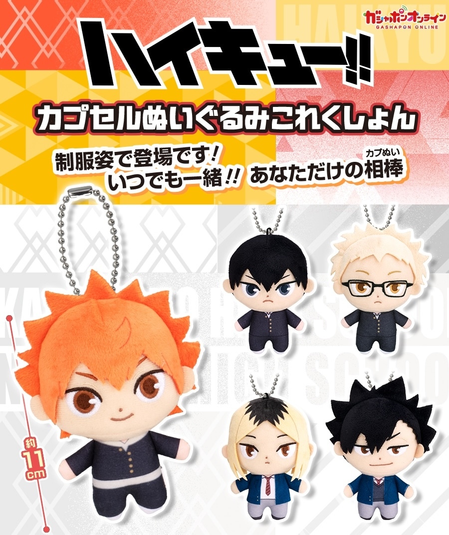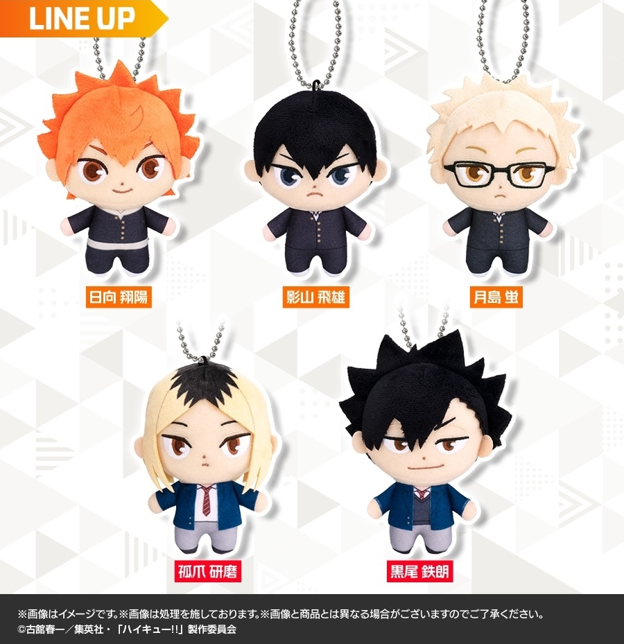 現在作品中的人氣角色們也將加入人氣的「轉蛋絨毛玩偶收藏」系列啦!本次的「排球少年!!轉蛋絨毛玩偶收藏」將作品中烏野及音駒兩間學校的人氣角色製作成高約 11 公分的絨毛玩偶,收錄日向翔陽、影山飛雄、月島螢、黑尾鐵朗以及孤爪研磨共五種款式,在可愛的比例下以布料剪裁縫製還原角色們身著各自高中制服的造型,短短的身形不管是捧在手中還是掛在包包上都讓人難抑抗拒,各位球員家屬們千萬不要錯過!