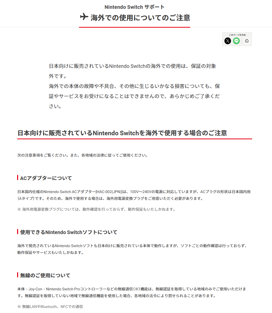 根據官方網站指出,在日本販售的 Nintendo Switch 若在海外使用,即使發生故障或問題,也無法享有保固或維修服務。不論是主機本身還是其他相關損害,都無法提供任何協助,請大家務必了解清楚,官方也列出在海外使用注意事項包含 :