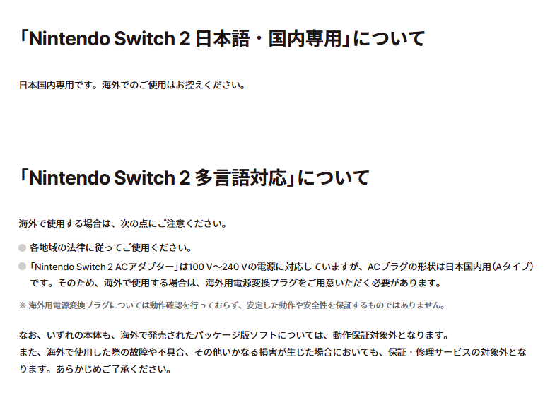 另外,官方也同時貼出針對「多語言版本」的使用環境說明頁面。任天堂表示,如果多語言版主機在海外使用時發生故障或問題,將不會納入保固或提供維修服務。