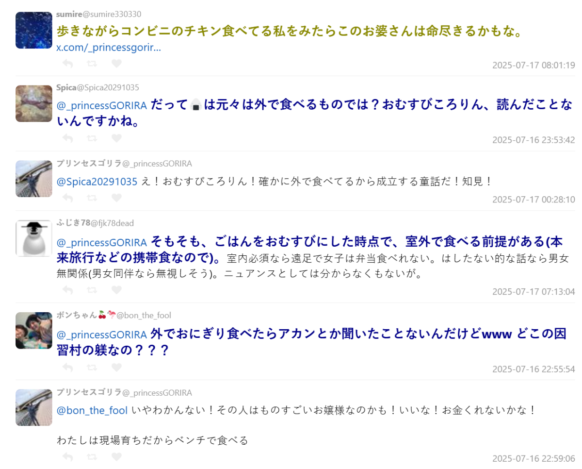 這段互動讓許多網友紛紛留言響應,有人笑稱「飯糰本來就是拿來在外面吃的吧?」、「在外吃東西不雅觀這種觀念,其實跟性別根本無關吧?只是不知道為什麼有些人會特別對女生有意見。」,也有網友打趣說:「如果我在路上邊走邊吃炸雞,阿嬤可能會當場昏倒。」